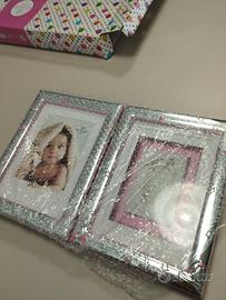 Un ricordo per sempre della manina o il piedino della tua bambina in un grazioso stampo in gesso. Accanto ad una bellissima foto, il tutto contornato da una cornice a tema in argento.