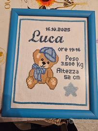 Realizzo cornici regalo con i dati nascita del bimbo/a da regalare, tutti creati e ricamati a mano, a scelta il personaggio che più piace, ottimo come regalo per i genitori e i nonni. 25€ da prenotare