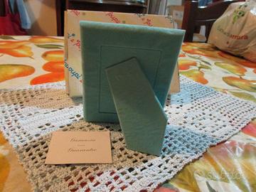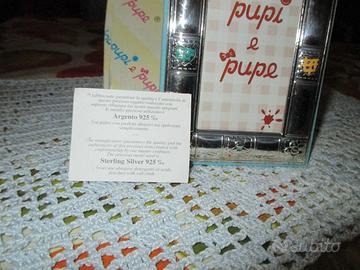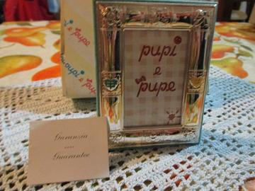 Cornice portafoto nuova "Pupi e Pupe" in argento e vellutino celeste vivo da regalare ad un Battesimo o per una nascita per maschietto. Nuova, mai usata, ancora in confezione originale composta da cornice, busta antiurto, garanzia, scatolo stampato con la marca. Misura cm 12,5*9,5. Disponibili, per inutilizzo, 1 culla Pali Cuccioli, 2 cesti per feste bimbo e bimba, centri augurali; abbigliamento e giochi.