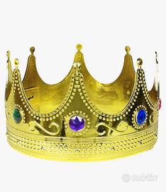 Corona da re o regina, misura grande da adulto (diam. 21 cm), in plastica rigida e robusta ma leggera, impreziosita da gemme e pietre preziose di vari colori; all'interno ha un morbido anello di gommapiuma per calzare nel massimo comfort e vestibilità a chiunque e per non scivolare.