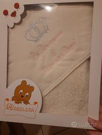 Setcomposto da lenzuolo copertina Vestitino bianco rosa. Camicina calzettini Scarpine bavetta accappatoio tutto con la scritta principessa Il