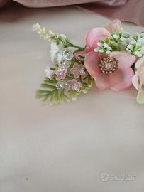 Corsage elegante e romantico dai colori pastello. Adatto ad ogni tipo di evento importante, matrimonio. comunione, ballo di fine anno, festa di compleanno ecc...Realizzato con fiori artificiali, nastro in organza, perline e strass. Si allaccia con un fiocco e si adatta ad ogni tipo di polso.Larghezza cm 13, altezza cm 7. Su richiesta si può realizzare in qualsiasi altro colore o modello. Sconti per quantità notevoli