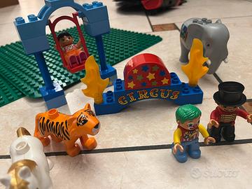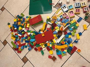 Costruzioni duplo con i personaggi di Cars, Masha e Orso, la dottoressa Peluches, personaggi ed animali del circo; due piattaforme verdi molto grandi (circa 40X40cm) piattaforme piu piccole, numerosi mattoncini, finestre, porte , sedie e tanti accessori.