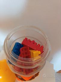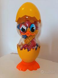 Simpatico porta costruzioni completo da 50 pezzi h circa 50cm , un occhio è un po' sbiadito e manca il manico del coperchio, ma è in buone condizioni