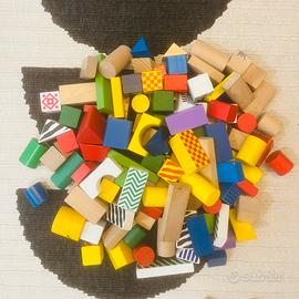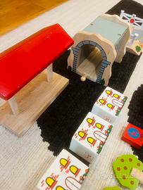 Vendo in blocco, come da foto, costruzioni in legno per trenino brio + accessori vari + 110 pezzi in legno varie forme.
