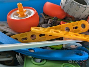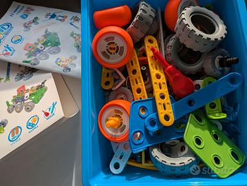 Il gioco include blocchi, elementi di collegamento e attrezzi per assemblare diversi modelli.