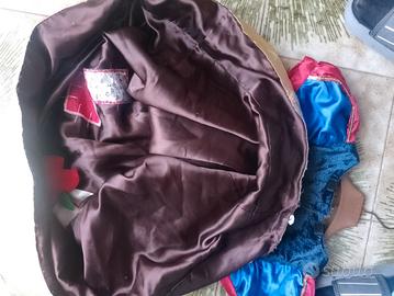 Dettagli:Include un corpetto in velluto blu, maniche a sbuffo e una gonna in tessuto lucido o raso.