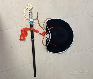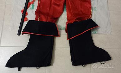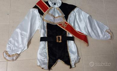 Costume "Capitano dei Pirati ", composta da blusa in raso bianca e bordure in passamaneria con chiusura dietro con automatici ,pantalone in raso rosso. Fascia in panno rosso e inserto teschio in oro. Cintura nera e chiusura con automatici. Copri stivali in panno nero e chiusura dietro con velcro a strappo. Cappello coordinato da pirata con teschio e spadino con cinturino rosso. Lavorazione artigianale. Blusa larghezza spalle cm 53. Lunghezza blusa cm 73. Lunghezza manica cm 53. Pantalone circonferenza vita cm 79. Lunghezza pantalone cm 61. Stivale chiusura con velcro, Cappello e Spadino.