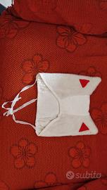 COSTUME DA GATTO per bambino di circa 3 anni. Composto da 3 pezzi: un pantalone in finta pelliccia bianco con coda da gatto; giacchino in panno rosso e finta pelliccia bianca, con colletto e polsini di merletto bianco; cappuccio bianco a forma di orecchie di gatto.