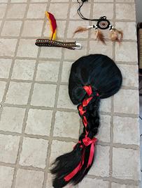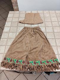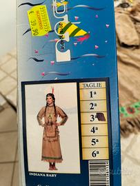 Costume di carnevale indiana baby, composto da maglia, gonna, cintura, copri scarpe, parrucca, collana e fascia elastica con piume. Taglia 3 anni.