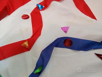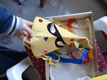 Vendo un abito di carnevale Mascherina (vintage) per bambine dai 3 ai 5 anni dipende l'altezza, comprende vestitino (fino alla gonna circa 41 cm lungo) e pantaloni (56 cm lungo) più accessori. Abbottonato dietro. Scatolo originale. La parte bianca del vestito presenta degli aloni gialli (vedi la foto 6). Il cerchio di ferro della gonna è parzialmente smontato per poter entrare nella scatola, basta reinserirlo nella guida