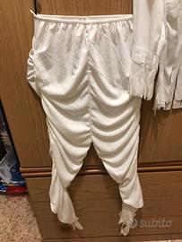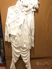 Costume bianco per carnevale (anche halloween) formato da maglia e pantalone separati. La maglia misura da ascella ad ascella cm 47. Il pantalone misura in cintura cm 26 ma è con elastico morbido, quindi estensibile, ed è lungo cm 90. Completa il tutto la parrucca bianca. La taglia indicata è L adatta a bambini di 9/10 anni