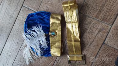 Elegante vestito composto da pantaloncino, maglia, mantello, cappello con piuma e cintura. In confezione originale. Poco usato. Indicato 1/2 anni - 73 cm