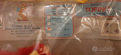 Costume usato 2 volte. Di colore Rosso, Nero e Giallo. Al suo interno tuta con cappuccio. Taglia 2-3 anni - Max 80 cm