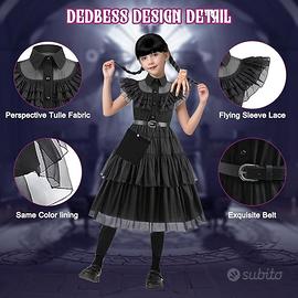Vendo bellissimo costume Carnevale o Cosplay Mercoledi' Addams con accessori usato una sola volta perfetto misura 140 cm Pacchetto Incluso? Riceverai 1 * vestito mercoledì, 1 * parrucche, 1 paio * calzino, 1 * cintura, 1 * collana, 1 * borsa e 1 * mano finta. L'abito Mercoledì è ispirato a famose serie televisive, basato sugli abiti indossati dai personaggi della serie tv. Indossalo per ricreare perfettamente il personaggio e abbracciare i tuoi personaggi preferiti! Tessuto di Alta Qualità? Il costume del mercoledì per bambini realizzato in poliestere di alta qualità, leggero, traspirante e delicato sulla pelle, morbido all'interno, comodo da indossare e non irrita la pelle. Elaborate con sofisticate tecniche di cucito e tintura, le linee sono pulite e dense, non facili da sbiadire e durevoli. Evidenziazione dei Dettagli? Lo squisito scollo in tulle nero, il taglio senza maniche e la gonna a tre strati creano un look elegante. Il design con bottoni frontali facilita l'inserimento e la rimozione dei vestiti. Combinalo con una bellissima parrucca nera, una collana, calzino a rete e una borsa, e la tua ragazza diventerà immediatamente l'eroina di una serie televisiva. Occasione Applicabile Questo costume del mercoledì per ragazze è perfetto da indossare ogni giorno, riunioni di famiglia, cosplay di Halloween, Natale, carnevale, feste di compleanno, costumi per feste a tema film horror, ecc. Il regalo di compleanno perfetto per fan e amici.