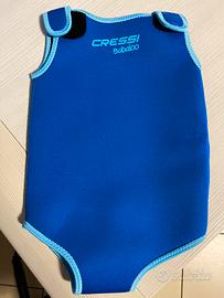 Taglia 12-18 mesi. Colore azzurro. 100% neoprene. Con velcro sulle spalline, sul fianco e sull’inguine, per adagiarvi comodamente il bambino e richiuderlo nel costume.