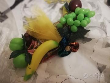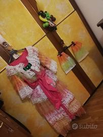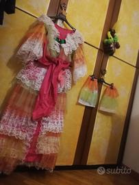 Costume di carnevale 'Brasiliana'. Interamente fatto a mano con pizzo. Gonna lunga aperta sul davanti e giacchina. Copricapo con frutta.