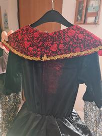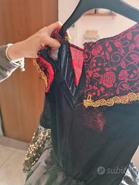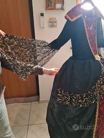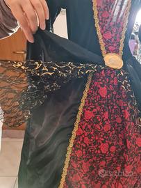 Vendo costume di Carnevale da dama medievale/nobildonna, ideale per bambina di 10–11 anni. L’abito è lungo ed elegante, nei colori nero e rosso con raffinate decorazioni dorate. Le maniche sono in pizzo lavorato e la gonna è ampia e molto scenografica, perfetta per Carnevale, feste a tema o recite scolastiche.