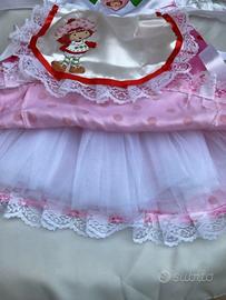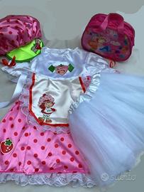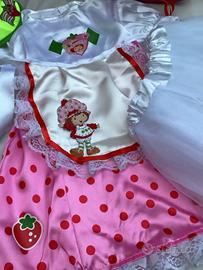 Costume di carnevale Fragolina dolce cuore - Strawberry shortcake, bambina - il costume e composto da 5 pezzi, vestitino in raso con maniche grinzitte a palloncino con fiocchetto laterali, sul bordo inferiore rifinito con pizzo bianco, grembiulino bianco in raso e pizzo, sottogonna in tulle con elastico in vita, cappellino in raso con visiera in gommina, abbinato con borsetta con immagine di strawberry, taglia 3 - 4 anni. Nuova senza etichetta, mai usato