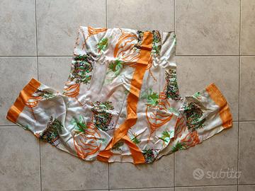 Casacca bianca a fantasia orientale (draghi e motivi decorativi) e chiusura stile kimono, completata da fascia/cintura arancione in vita. Pantaloni arancioni abbinati, morbidi e comodi.