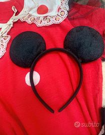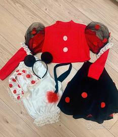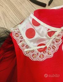 Costume di Carnevale da bambina di Minnie la maglia rossa presenta un colletto bianco con pizzo e pois rossi, maniche a sbuffo trasparenti nere, e grandi pois bianchi sul davanti. La gonna nera con tulle ha dei pois rossi applicati e una piccola coda da topo. Pantaloni corti bianchi con pizzo arricciato sui bordi inferiori. Made in Italy Sartoria Giacinta Venezia creazioni artigianali