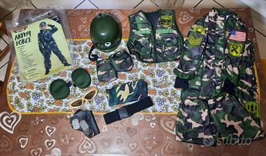 Costume Militare di Carnevale da soldato mimetico 5-6 anni. Vestito militare contiene tuta militare, giliet militare, paio di ginocchiere, cintura con tasche, targhetta con nome, occhiali, elmetto, bandana.