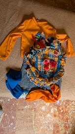 Abito: Scamiciata a quadretti (tartan) con toppe colorate e rifiniture in pizzo e fiocchi.