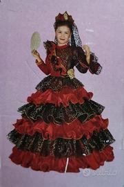 Costume da spagnola per bimba 5/6 anni (veste comodo, fino ai 9 anni). Molto grazioso, in velluto e tulle. Con sottogonna a due cerchi. Velo a mantiglia fino alle spalle. Come nuovo, con scatola originale . Aggiungo borsellino in raso e pizzo, per i coriandoli.