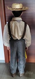 Salopette in tessuto marrone con bretelle e applicazione, camicia manica lunga in cotone beige, foulard in cotone quadrettato, copriscarpe in tessuto effetto nabuk marrone, cappello di paglia sfrangiato con elastico.