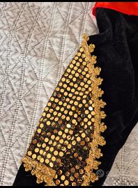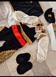 ⁃ Completo composto da giacca, pantaloni, mantello e cappello, - Dettaqli dorati e fascia rossa in vita, ⁃ Include un paio di copri scarpine