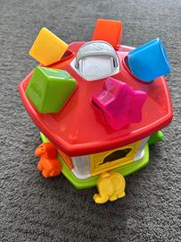 Un cottage con 5 animaletti e 5 formine da inserire nei rispettivi fori di porte e tetto. Tutte le formine si possono poi recuperare aprendo le porticine con la chiave corrispondente per forma e colore oppure sollevando il tetto del cottage.