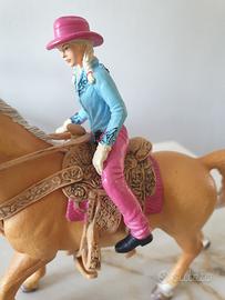 Cowgirl con cavallo, briglia, sella e 2 barili.