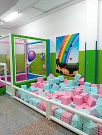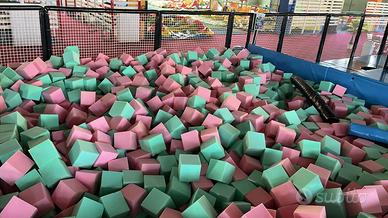 Una vasca piena di morbidi cubi di spugna ignifughi colorati o neutri, su cui i bambini potranno lanciarsi, senza alcuna paura di potersi far male.