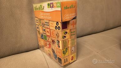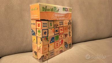 cubi in legno per bambini dai 24 mesi. cubi assortiti con lettere, numeri, operazioni semplici, parole in inglese e mini puzzle. 40 dadi con cui passare momenti divertentissimi con i figli. ottimi anche per fare costruzioni!