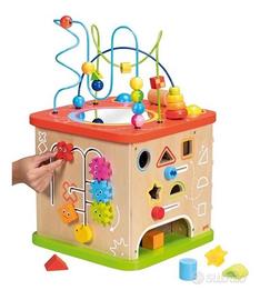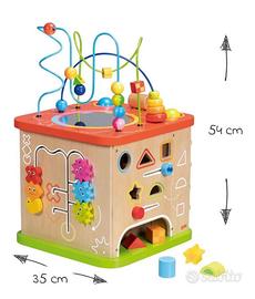 Cubo attività XXL in legno Goki-ogni lato del cubo presenta diverse attività che stimolano la curiosità e l’abilità motorie dei bambini