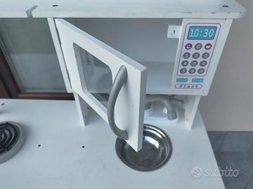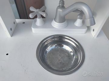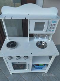 Cucina in legno con qualche segno di usura ma ancora integra e perfettamente utilizzabile. Va solo avvitato uno dei 2 fuochi. Regalo anche con qualche accessorio