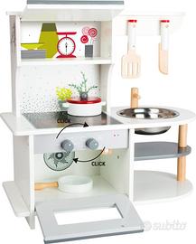 Piccoli cuochi, ai fornelli! Ce n'è per tutti i golosi! Il forno è provvisto di uno sportello richiudibile, i regolatori della temperatura emettono un clic se girati ed il lavandino in metallo è estraibile. Con gli utensili giusti si può preparare e cucinare in forma giocosa qualsiasi tipo di prelibatezza. L'armadio da cucina offre spazio a sufficienza per i golosi prodotti del negozio di alimentari. In questo modo tutto resta in ordine ed al suo posto.