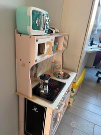 Vendesi cucina giocattolo con tanti accessori tra cui fornetto a microonde, pos e carta di credito, piattini, pentole, posate, spugnetta, moka, asciugamano e asciugapanni, oltre che varie tipologie di cibo.