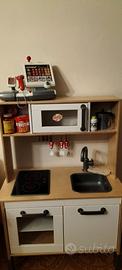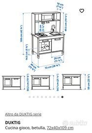 Cucinetta originale praticamente nuova, IKEA modello DUKTIG completa di accessori originali LATSAS e verdure gioco più tutti i componenti extra che vedete in foto... c'è praticamente tutto quello che serve per far giocare il vostro bambino ed emulare un vero chef. Compresa anche una simpatica cassa automatica per simulare la spesa al supermercato. Come potete notare il tutto sta comodamente disposto all'interno dei scomparti, in ordine e pronto per l'uso.