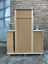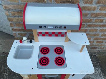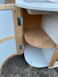 Cucina Hape in legno con due ante laterali, forno apribile, lavandino di plastica.