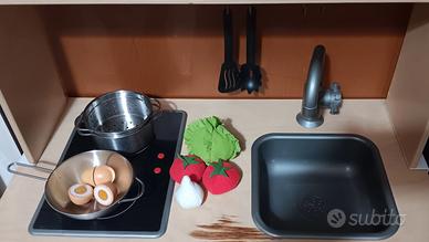 come da foto vendo cucina giocattolo IKEA completa di accessori (pentole, ortaggi, uova, paletta, coppino per la pasta, grembiule con cappello da chef e stampini).