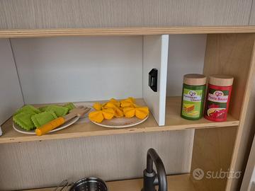 Cucina giocattolo in legno IKEA in ottime condizioni con piccoli segno di usura. Inclusi piedini regolabili in altezza. In regalo set pentoline e set pasta come in foto.