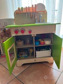 Cucina giocattolo marca Hape, in legno verde, composta da forno, piano cottura, lavello e un armadietto. La cucina contiene anche il set di stoviglie e accessori in legno.