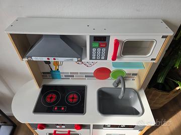 Splendida cucina in legno per piccoli chef, ricca di dettagli e molto robusta. Perfetta per stimolare la fantasia! Dotazione: Forno, frigorifero con dispenser, microonde, piano cottura, lavello e cappa. Completa di manopole girevoli e decorazioni curate. Stato dell'oggetto: La cucina è in buono stato e solidissima. Segnalo, per massima correttezza, una riparazione effettuata con colla a caldo sull'angolo dello sportello del forno; la struttura è ora rinforzata e perfettamente funzionale. Ritiro: Solo ritiro a mano in zona Udine.