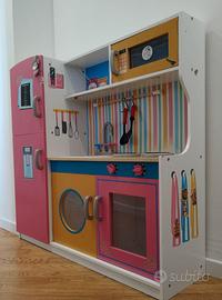 Cucina in legno per bambini, misure 104 (L) X 35 (P) x100 (h) cm. Tenuta in discrete condizioni ma perfettamente funzionante e dotata in aggiunta di una barra per appendere gli attrezzi da cucina. Costo 55€. Non spedisco. Ritiro in zona Croce di Casalecchio