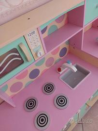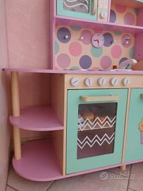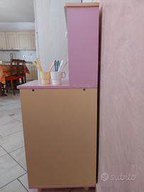 Cucina in legno Froggy ottime condizioni, con ante apribili e interni spaziosi. Piano cottura, mensole, forno microonde, utensili, lavello. compresa frutta, verdura, piattini, bicchieri, pentoline. cm L 124 x P40 x H102