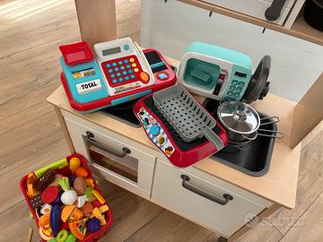 Vendo cucinetta in ottime condizioni completa di pentole, alimenti giocattolo, forno a microonde, friggitrice, cassa supermercato e tanti altri accessori come da foto.