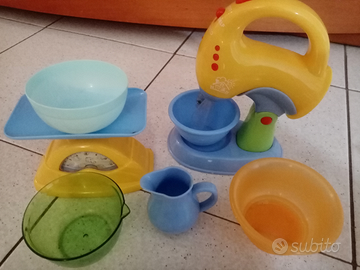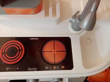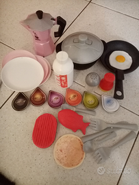 Vendo cucina Smoby Tefal. Plastica robusta, lavabo, forno, lavastoviglie, macchina caffè, frigorifero, dispensa, tutti con sportelli apribili. Tantissimi accessori inclusi (tegame con pasta, padella con hamburger che cambia cottura girandola etc) ... più altre verdure e frutte, bilancia, sbattitore, zuccheriera, moka. Divertimento assicurato
