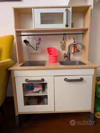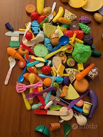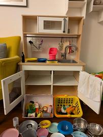 Cucina per bambini con accessori: piatti, pentoline, posate, cibo vario, carrellino spesa. Alcuni oggetti sono tenuti bene, altri rovinati, altri magari parziali..vendo in blocco unico. La cucina ha i ripiani interni un pò rovinati ma si chiude ancora bene e funge al suo scopo per un bambino..
