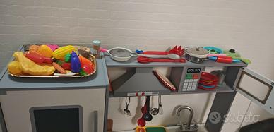 Cucina giocattolo in legnoper bambini, include elettrodomestici come un frigorifero, con dispenser ghiaccio, un microonde, un forno e un lavello con rubinetto.Tutto funzionante. Cappa, luci, microonde...